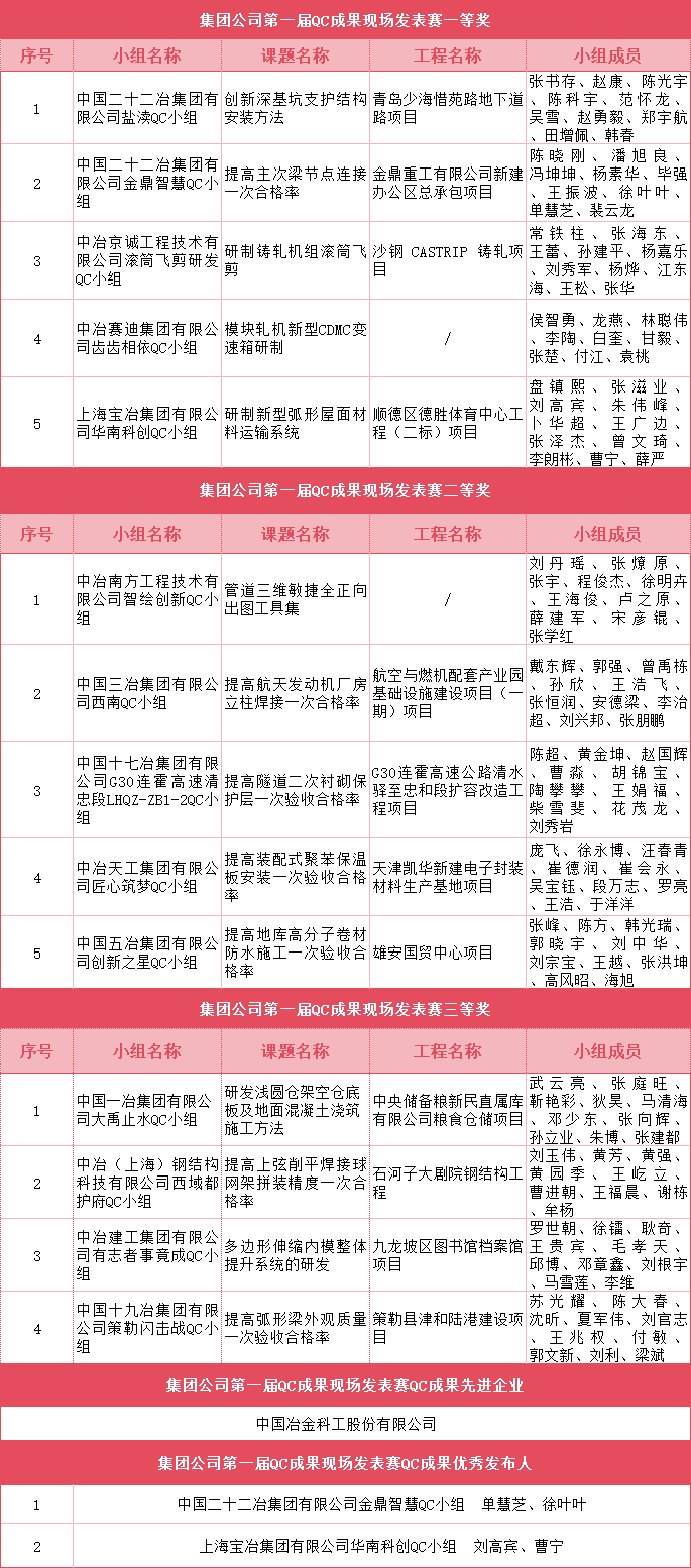 1月28日,由集团公司企业管理部主办,中国二十二冶集团有限公司承办的集团公司第一届QC成果现场发表赛活动在河北唐山召开。本次活动中,公司组织推荐13家子企业的14项质量管理小组成果斩获佳绩,其中一等奖5项、二等奖5项、三等奖4项。此外,中国·银河集团官方地址股份有限公司荣获集团公司“QC成果先进企业”,中国二十二冶集团有限公司单慧芝、徐叶叶,上海宝冶集团有限公司刘高宾、曹宁荣获集团公司“QC成果优秀发布人”。QC小组活动的扎实开展,有利于激发现场人员解决质量问题、实施质量改进的积极性和创造性,推进质量人员素质和意识有效提升,营造“全员参与质量,人人关心质量”的氛围,以实际行动助推企业高质量发展。